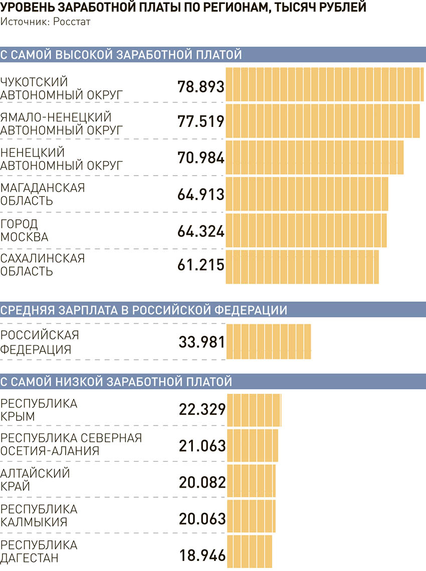 Первое место по размеру зарплат в этом году занял Дальневосточный федеральный округ. Среднемесячная заработная плата там составляет 42 тысячи 877 рублей. При этом лидером по величине зарплат продолжает оставаться Чукотский автономный округ, там за месяц можно заработать до 78 тысяч 893 рублей. Немного отстают Магаданская и Сахалинская области, там средние зарплаты почти в два раза превышают среднюю по России и составляют соответственно 64 тысячи 913 рублей и 61 тысячу 215 рублей. Дальний Восток опережает даже Центральный федеральный округ, где в среднем граждане зарабатывают 41 тысячу 848 рублей.