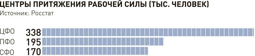 Разница темпов рождаемости в регионах создает дисбаланс рабочей силы, отмечает Захаров. Молодежь рождается не там, где для нее есть работа. Эксперт отмечает, что в советское время были удачные примеры стимулирования внутренней миграции, когда за работой люди ехали из одного региона в другой. Сейчас же таких примеров мало. Центрами притяжения трудовых ресурсов являются Москва и Санкт-Петербург, переломить этот тренд пока не удается.