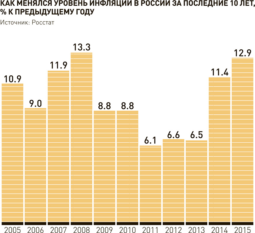 По данным Росстата, общий уровень инфляции в России составил 12,9 процента, что оказалось намного выше показателя за 2014 год в 11,4 процента. Больше всего цены поднялись в Республике Крым – на 27,6 процента, а также в Севастополе – на 21 процент. Тройку лидеров по росту инфляции в 2015 году замкнула Ингушетия с показателем 17,5 процента. Меньше всего цены за 2015 год выросли в Хакасии – на 10,3 процента, и в Оренбургской области – на 10,4 процента. Третье место с показателем в 10,5 процента поделили между собой Якутия и Ямало-Ненецкий автономный округ.